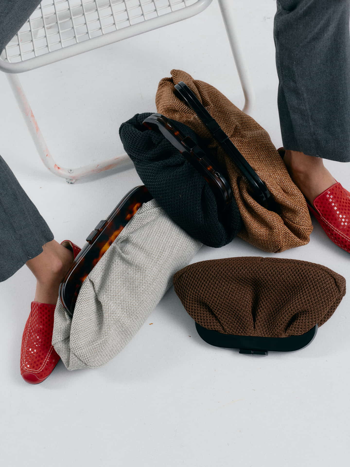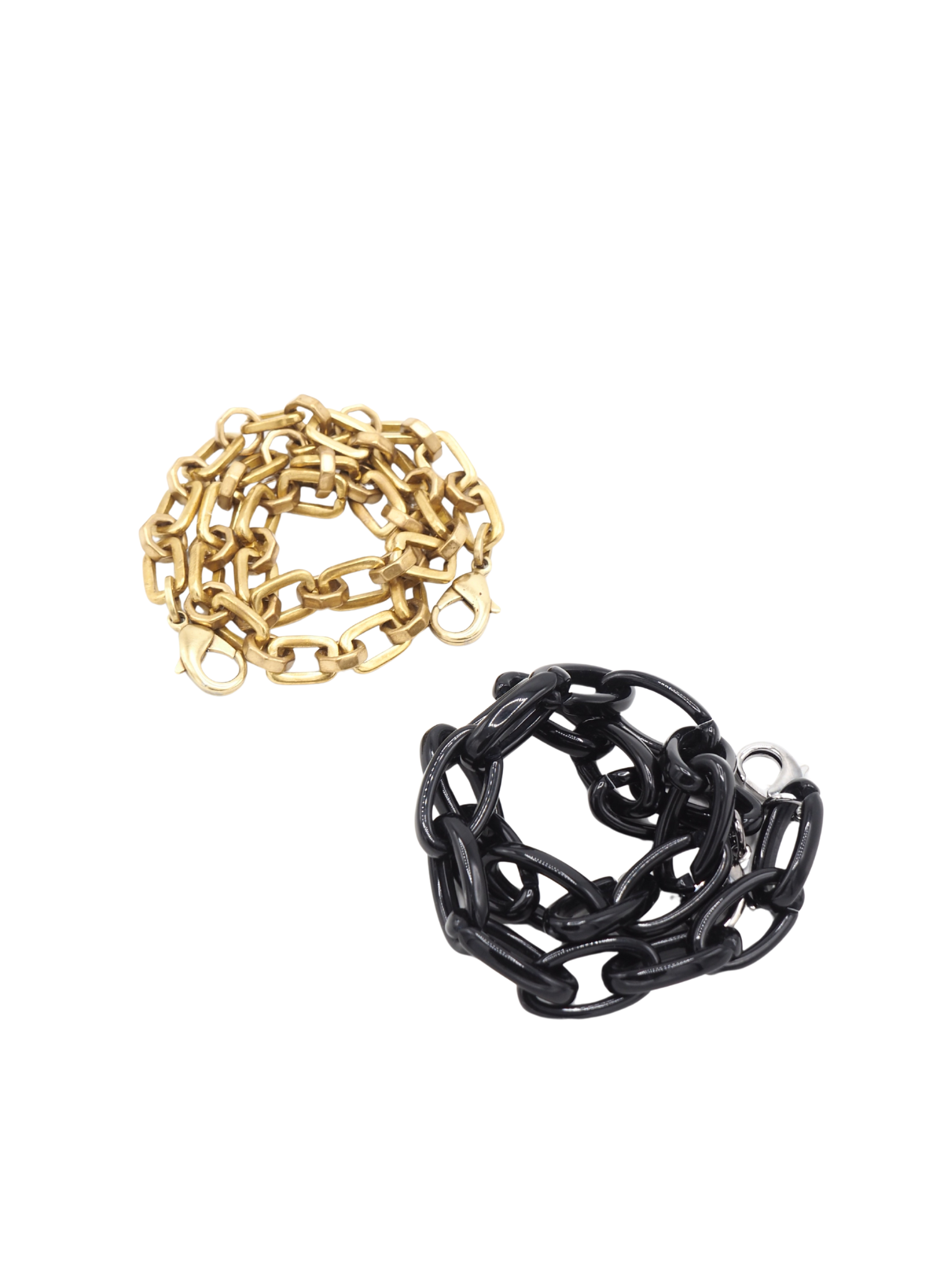 Inclou dues cadenes: una negra de resina i una daurada de llautó, per poder intercanviar-les o fer-la servir com a bossa de mà, sense nansa.