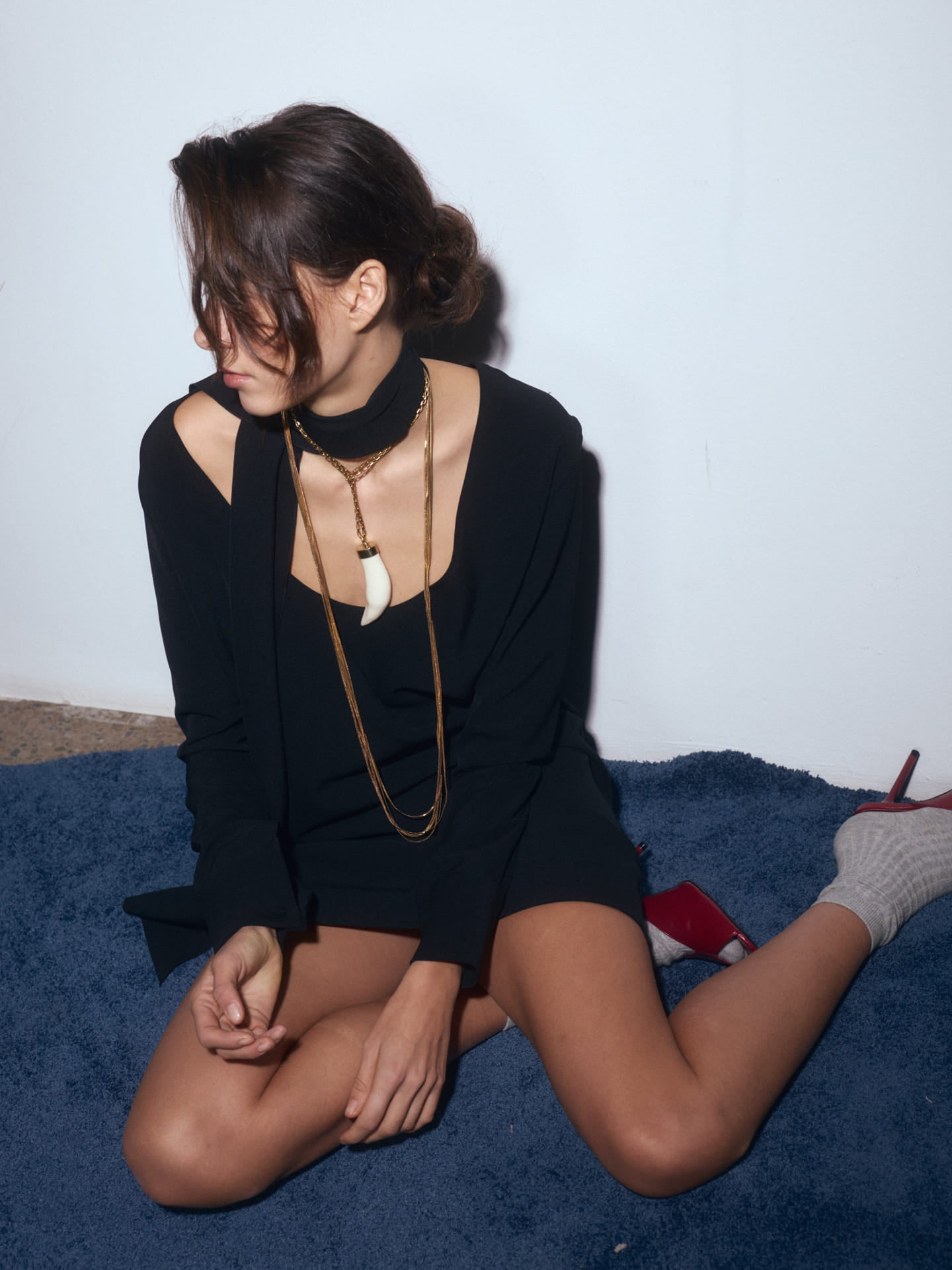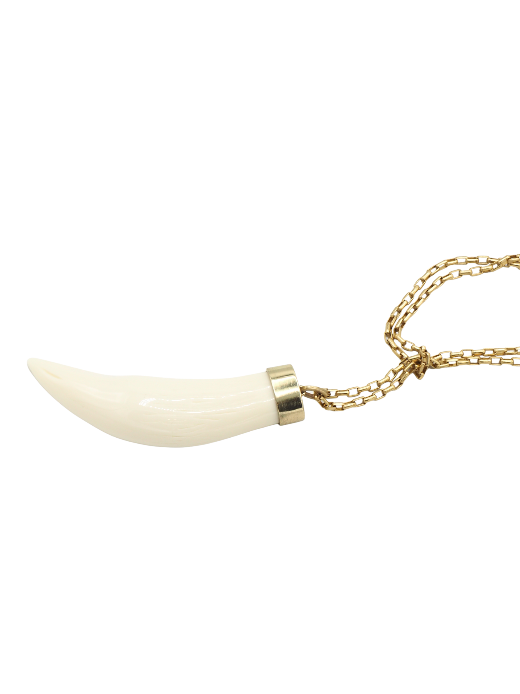 Collaret d'anelles rectangulars amb una banya de penjoll. S'ha de passar la cadena darrere del coll i introduir la banya per dins, per col·locar-lo tipus corbata.