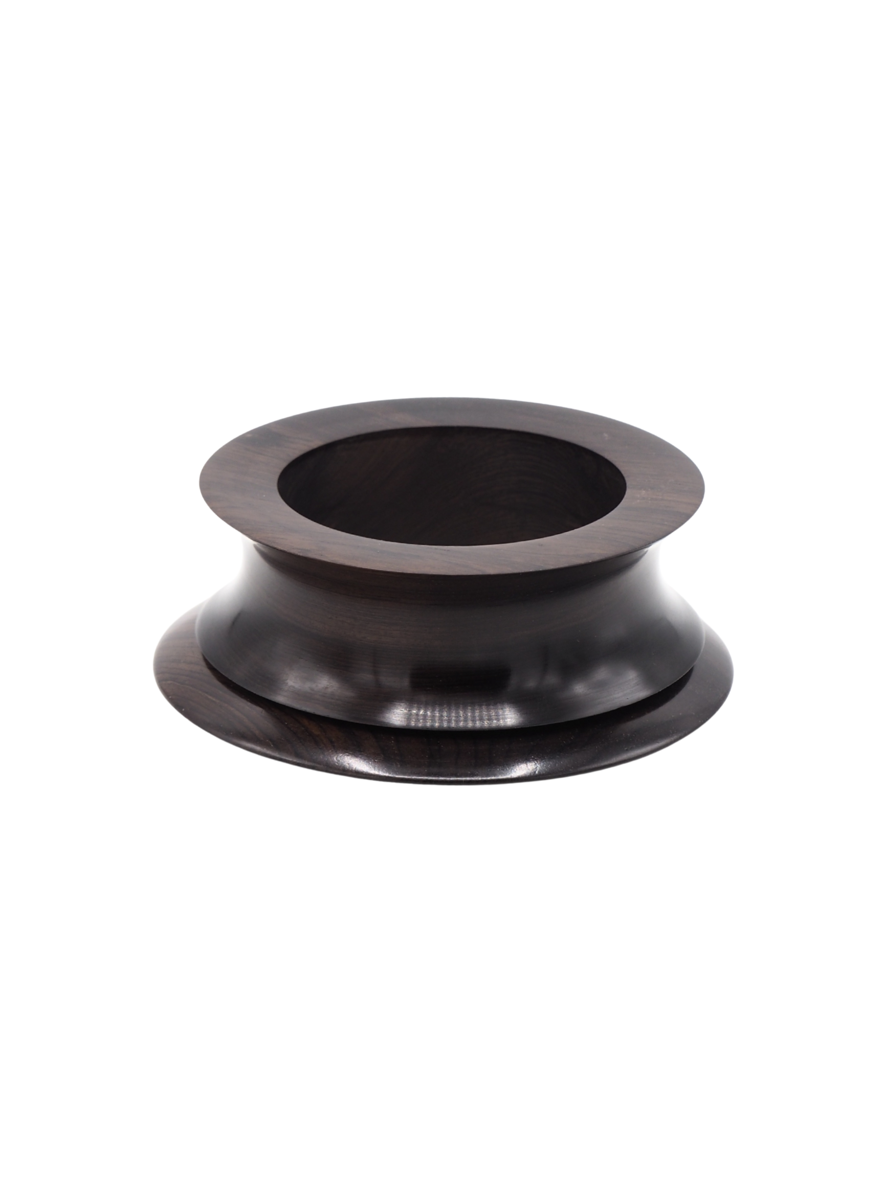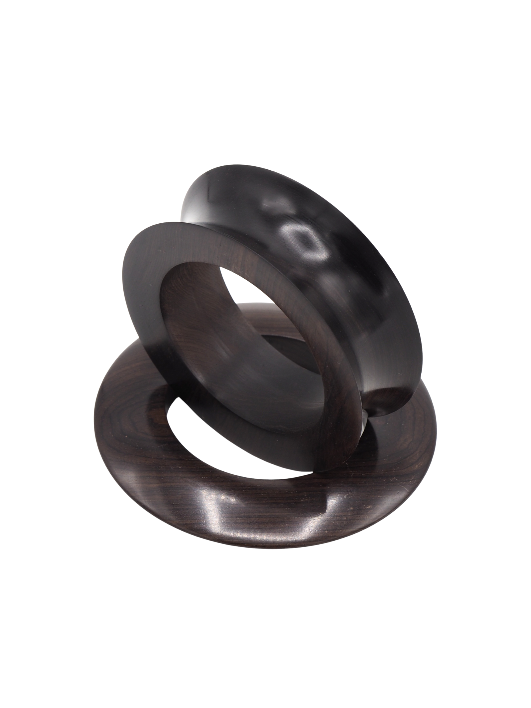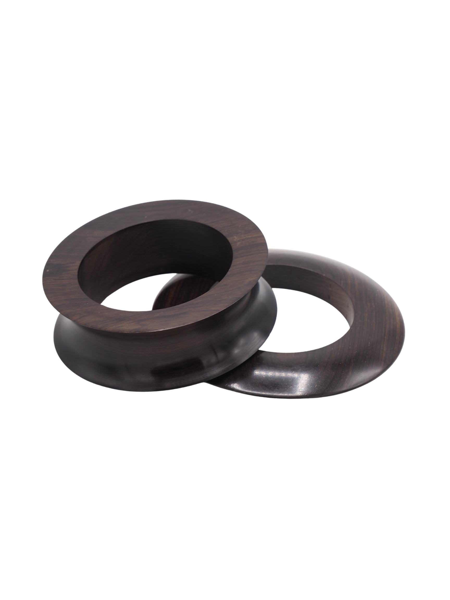 Pack de dues polseres de fusta marró fosc. Una gruixuda amb forma còncava i una altra amb forma de disc.