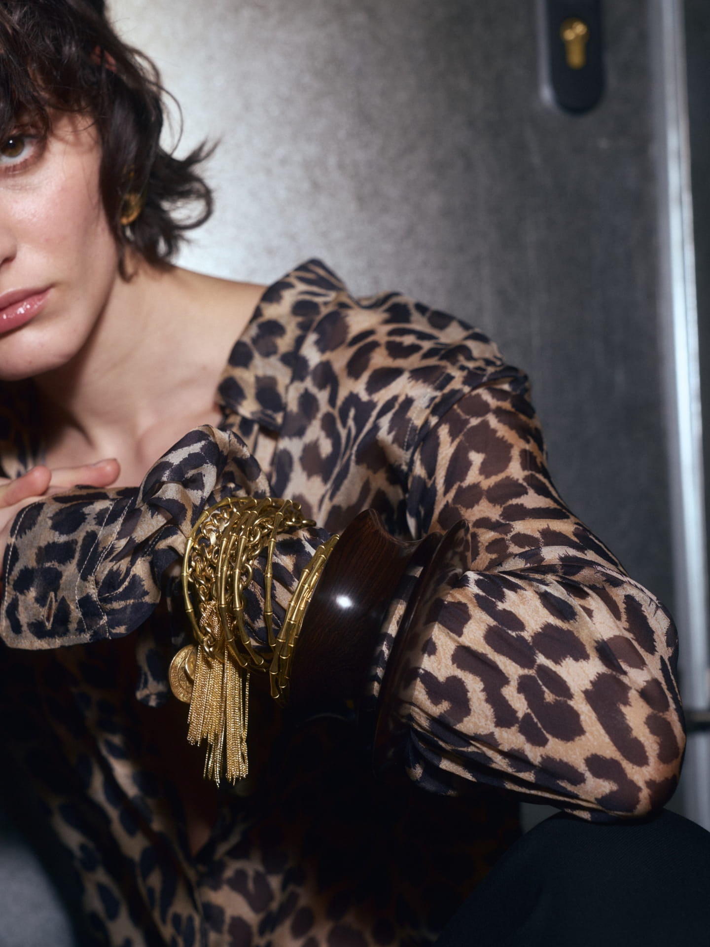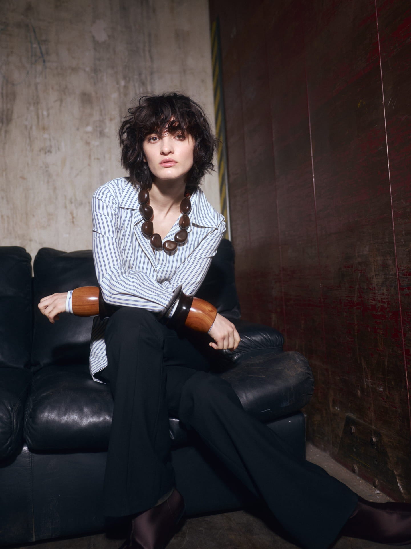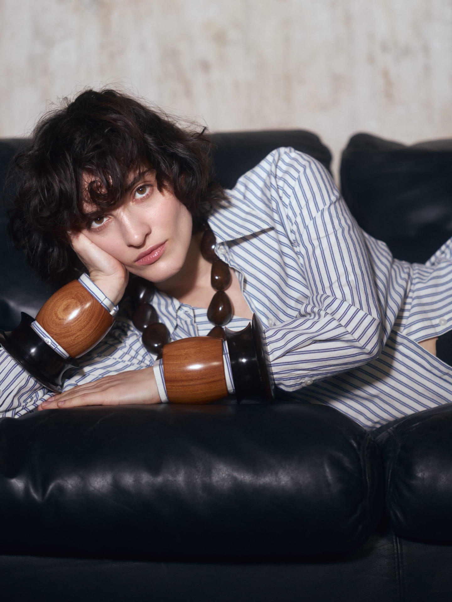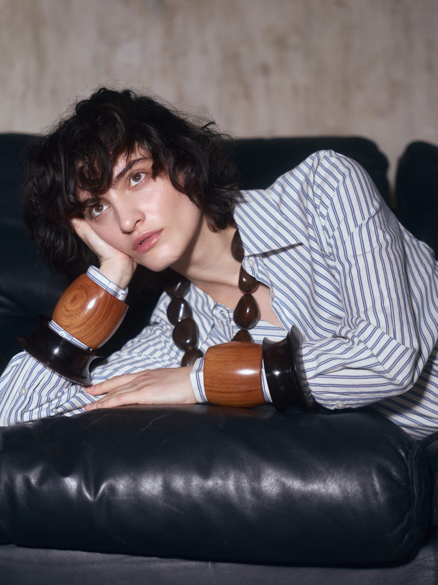 Pack de dues polseres de fusta marró fosc. Una gruixuda amb forma còncava i una altra amb forma de disc.