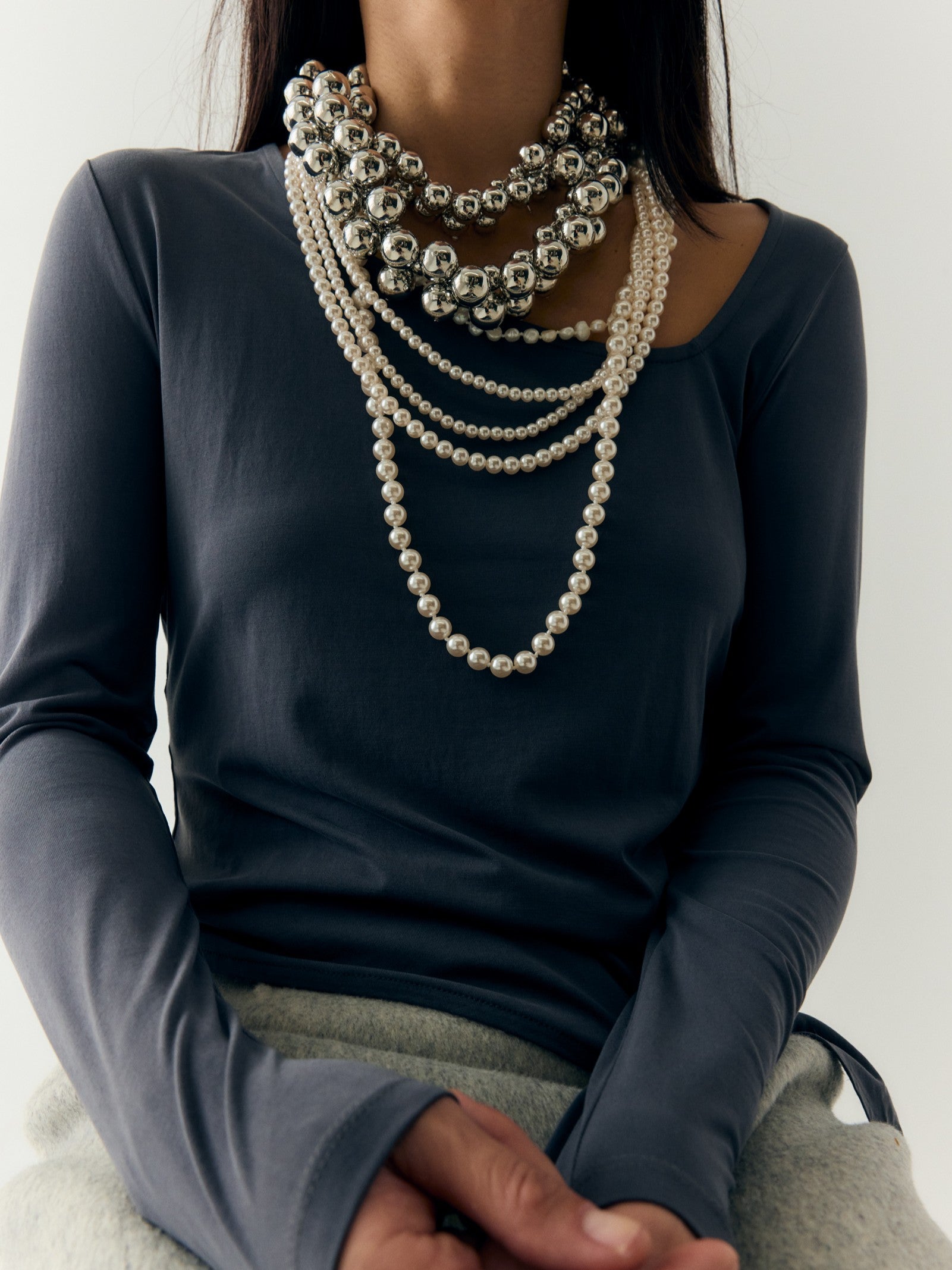 Collar XL, fet amb diverses tires de perla de riu i perla amb nucli de vidre, a diferents alçades.