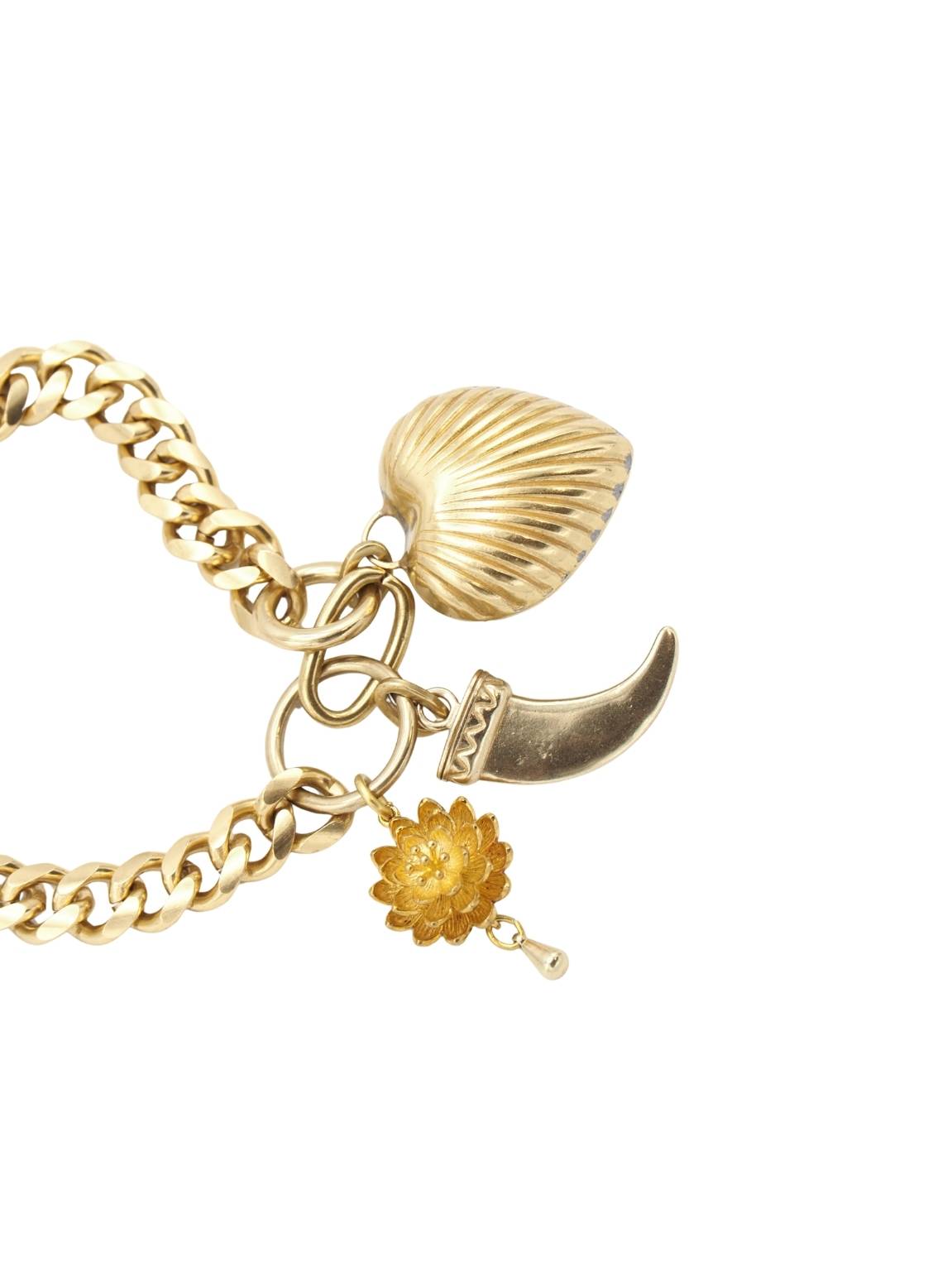 Collaret a mig pit, compost per una cadena d'anelles de llautó, tres penjolls, amb forma de flor, banya i cor, i tres pedres naturals multicolor al tancament.