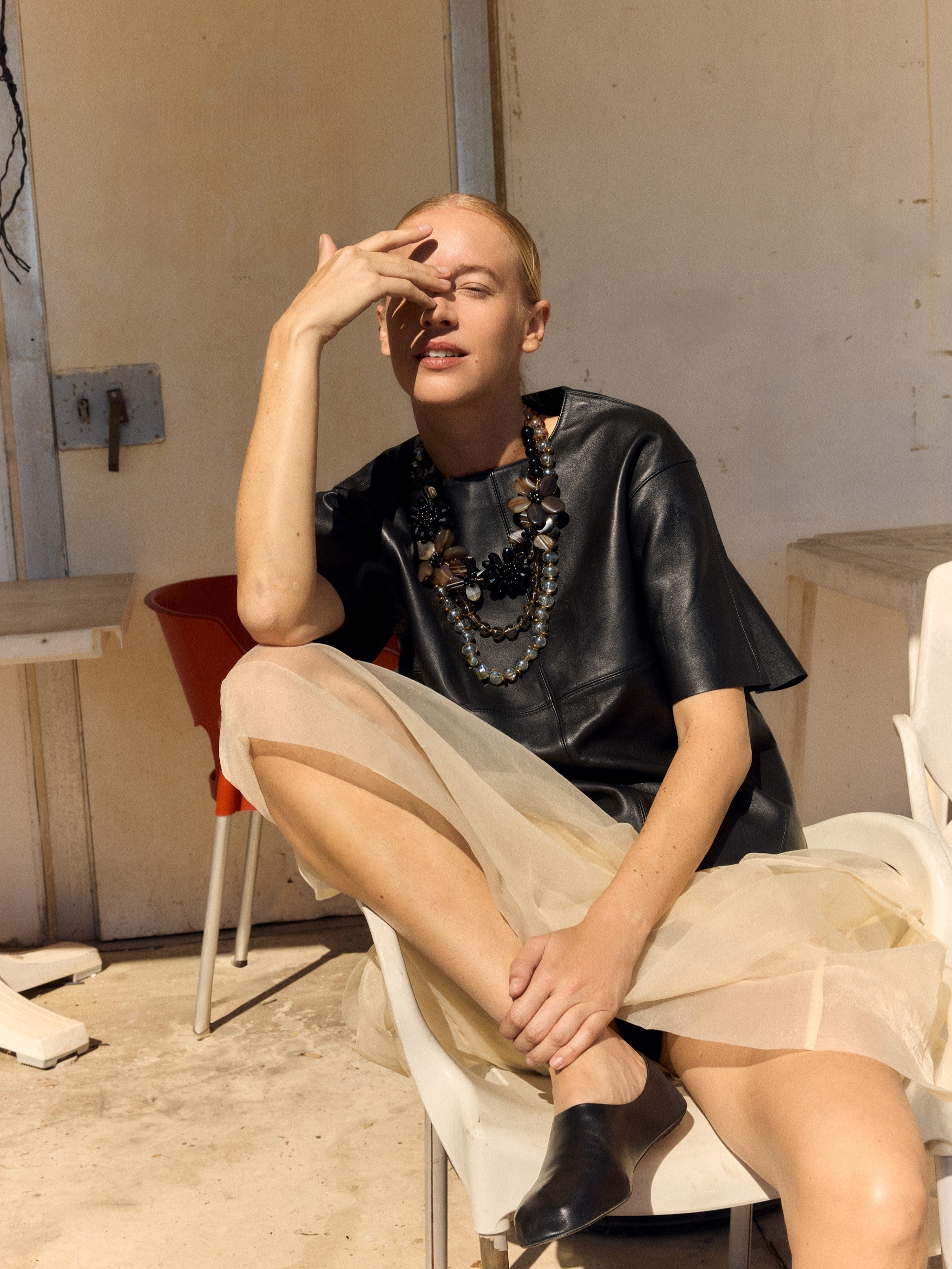 Collar con dos tiras de bolas de cristal a tono, y pequeños discos separadores de latón.