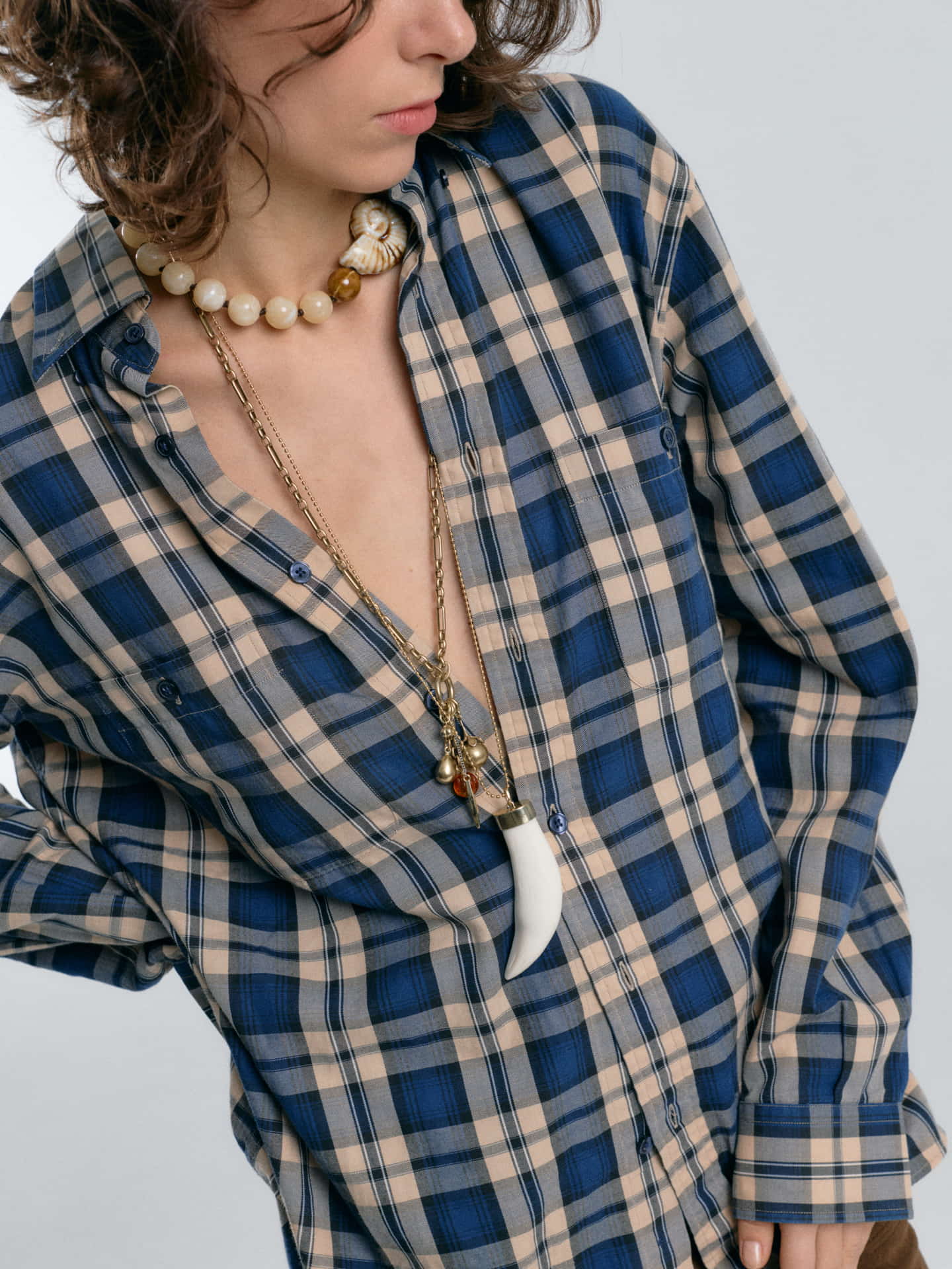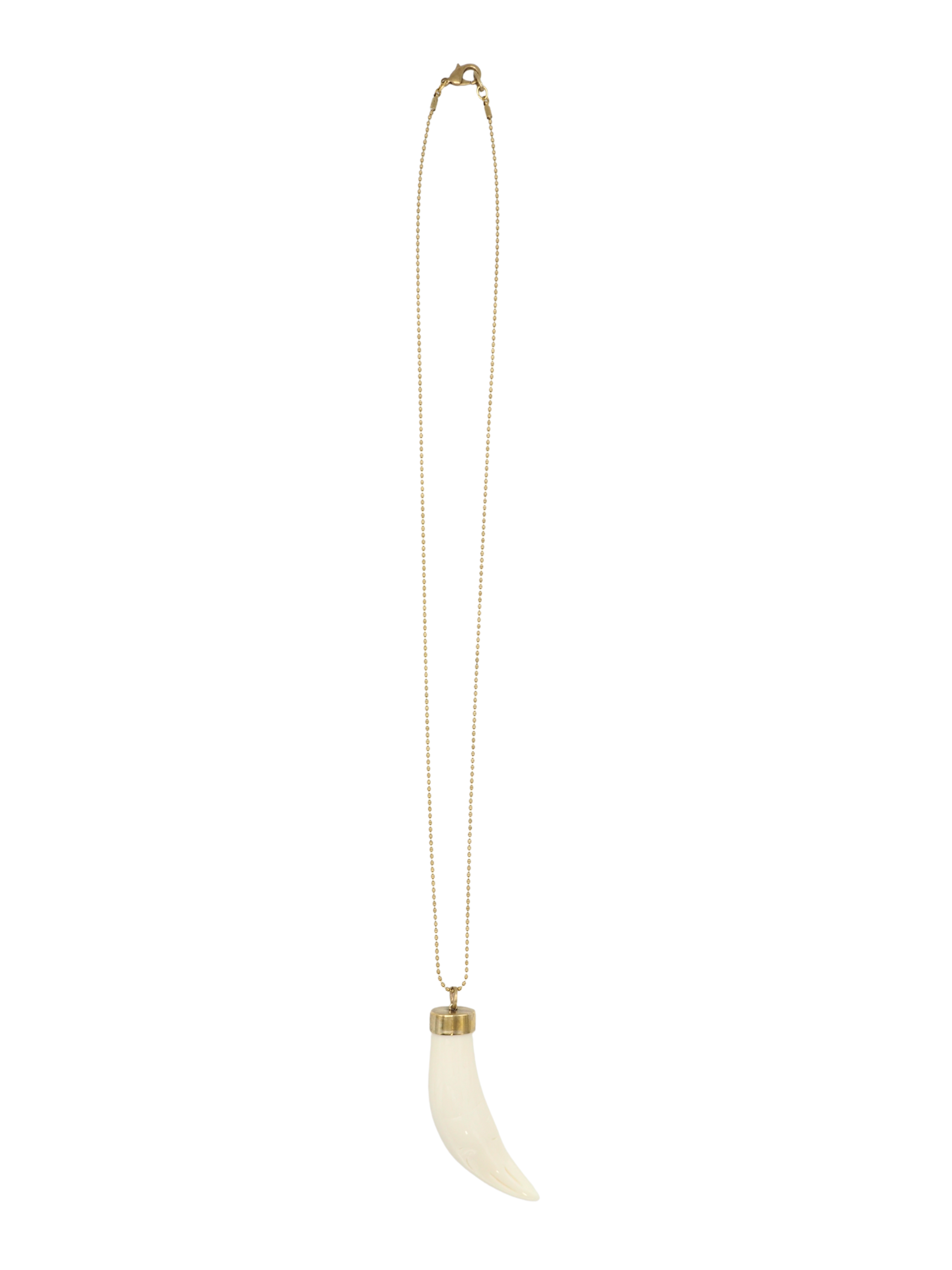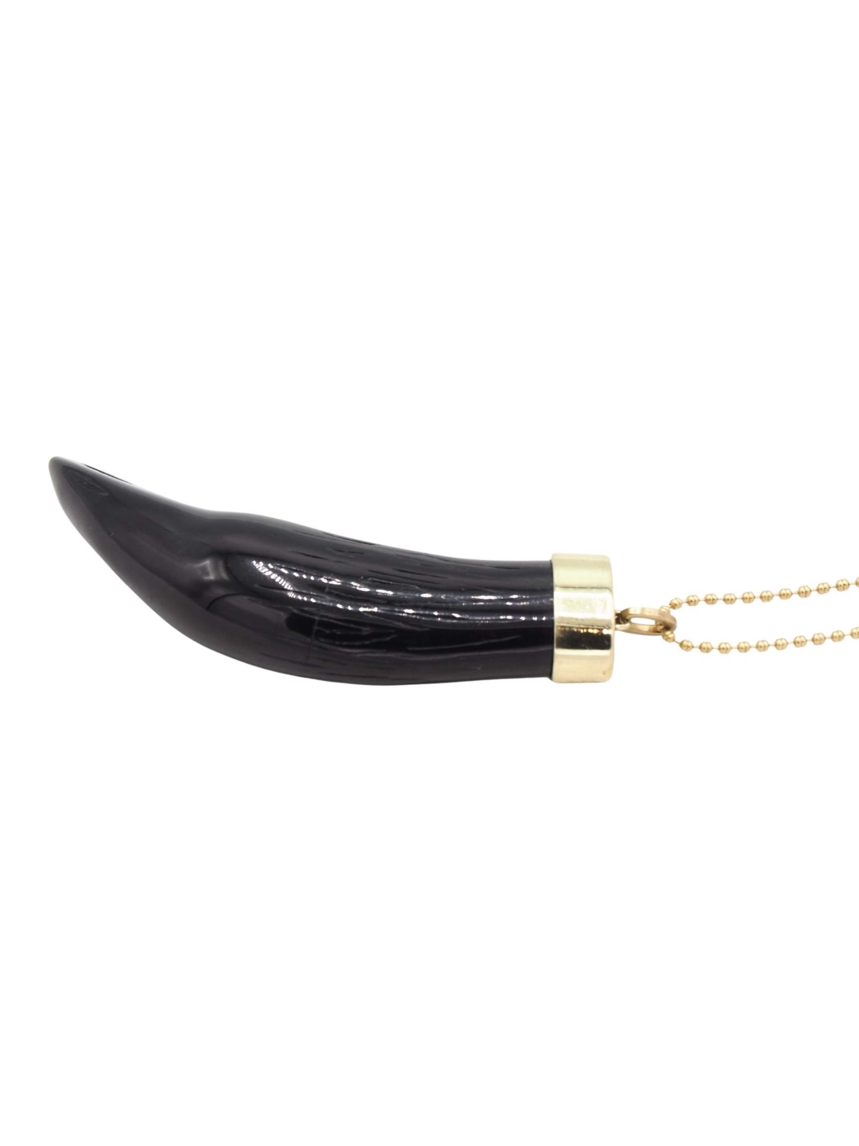 Collar extra largo, hecho con una cadena fina de bolitas y un colgante con forma de cuerno.