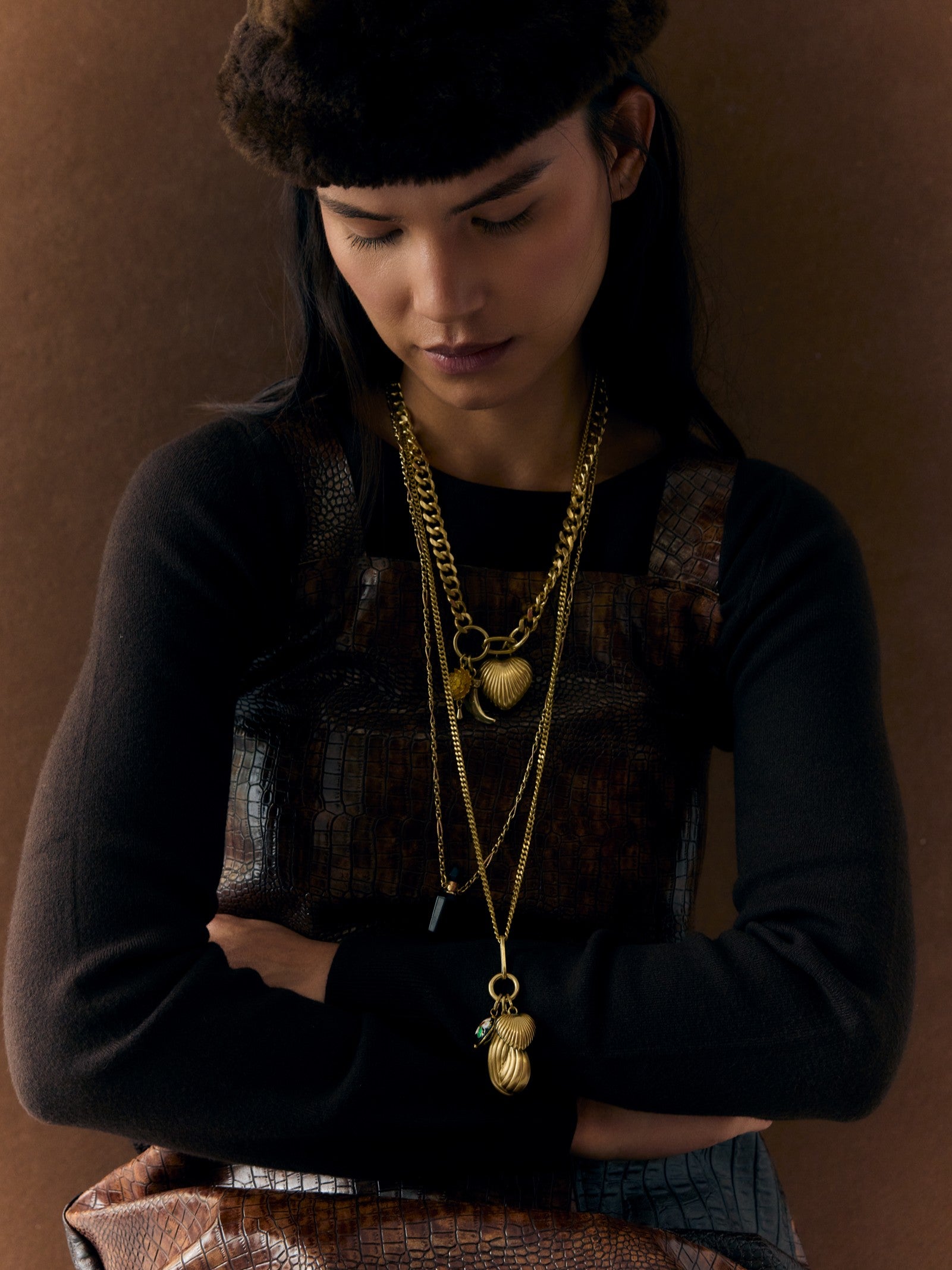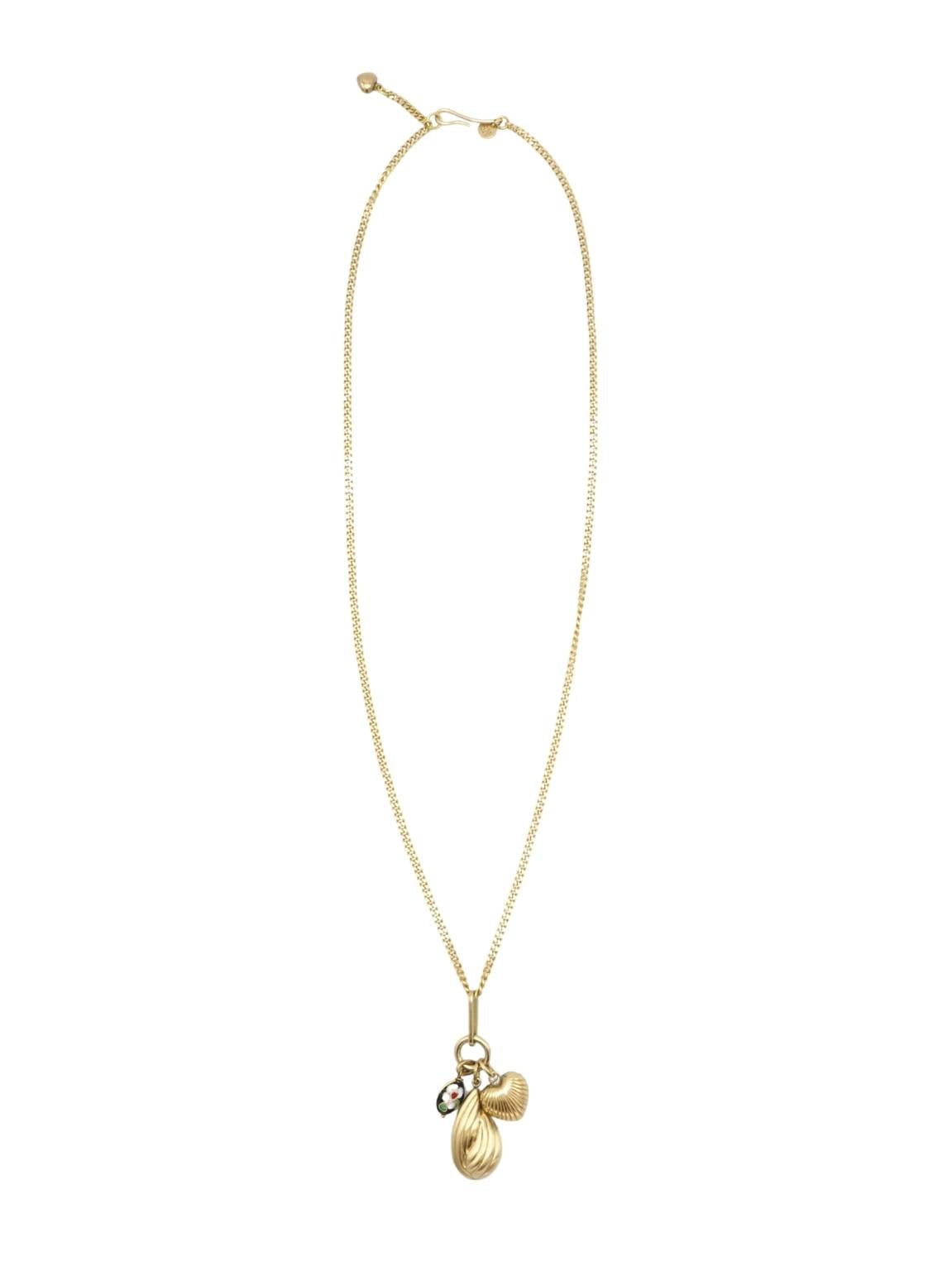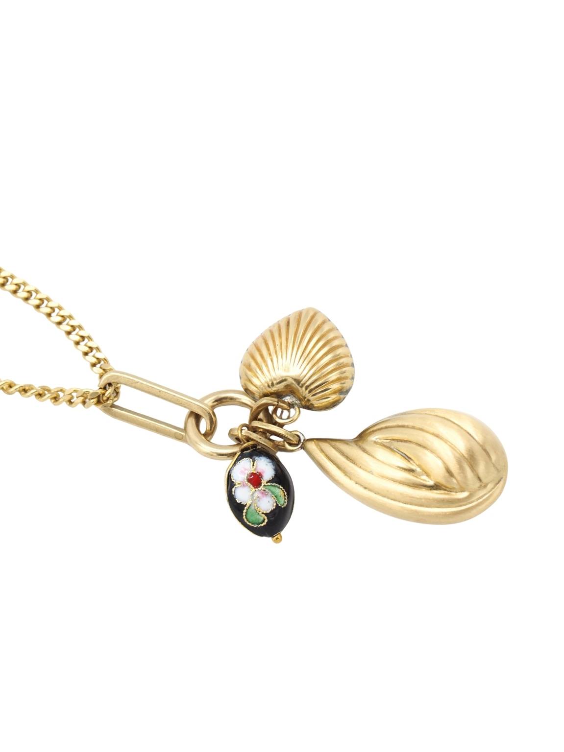 Collar largo, hecho con una cadena de anillas de latón, dos colgantes, con forma de gota y de corazón, y un tercer colgante esmaltado con dibujo floral.